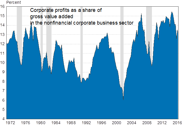 But periods of very high profitability tend not to last very long, and it seems that U.S. corporate profits peaked in the second half of 2014, and are now on a downward trend. Some of the trends that contributed to high profits earlier have reversed themselves in recent years. Offshoring activity has declined substantially from the previous decade, productivity growth has been anemic in the last six years, and tighter labor markets are beginning to accelerate wages. On top of that, the appreciation of the U.S. dollar lowers profits generated in other countries.