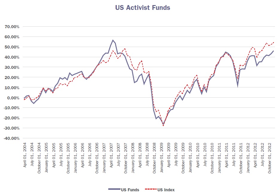 - It is particularly noteworthy that CalSTRS, one of the major public employee pension funds and one of the leaders in proxy voting and investing in activist hedge funds, has recently reported that its aggregate investments in activist funds as of October 2012 trailed the United States public equity market, as shown by this chart from its annual report.